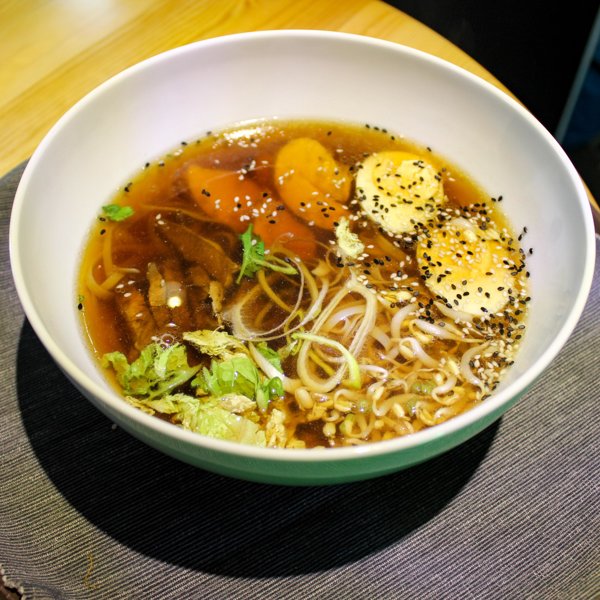 Заказали доставку рамен и сендвичи, не вкусно от слова совсем. Рамен не соответствует фото абсолютно, даже приблизительно не похож. Вместо прозрачного бульона какая-то темная жижа с лапшой, мясо с мелкими костями чуть зубы не сломали. Бульон очень тяжелый. Вместо палочек длинную лапшу предлагается есть комплектными ложками...